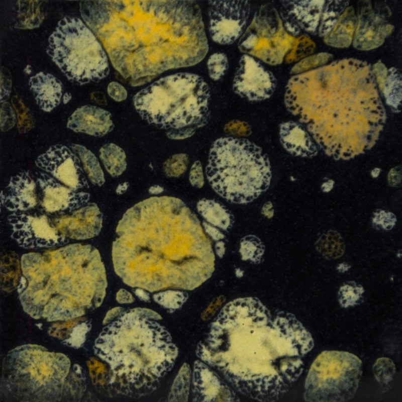 Cone 06: Black Iris is an opaque black base glaze with a variety of golden/yellow/brown crystals.