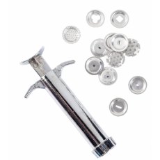 Handheld detail extrusion tool. With this you can force soft clay through various shaped openings in an assortment of 19 interchangeable discs. The barrel is 1.8cm diameter and 8.9cm long.